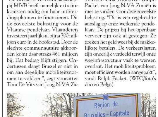 De Jong N-VA-afdelingen van Zaventem en Zoniën zijn verontwaardigd over de nieuwe pendelaarsbelasting die Brussels minister van mobiliteit Brigitte Grouwels wil invoeren voor de automobilisten die Brussel binnenrijden.